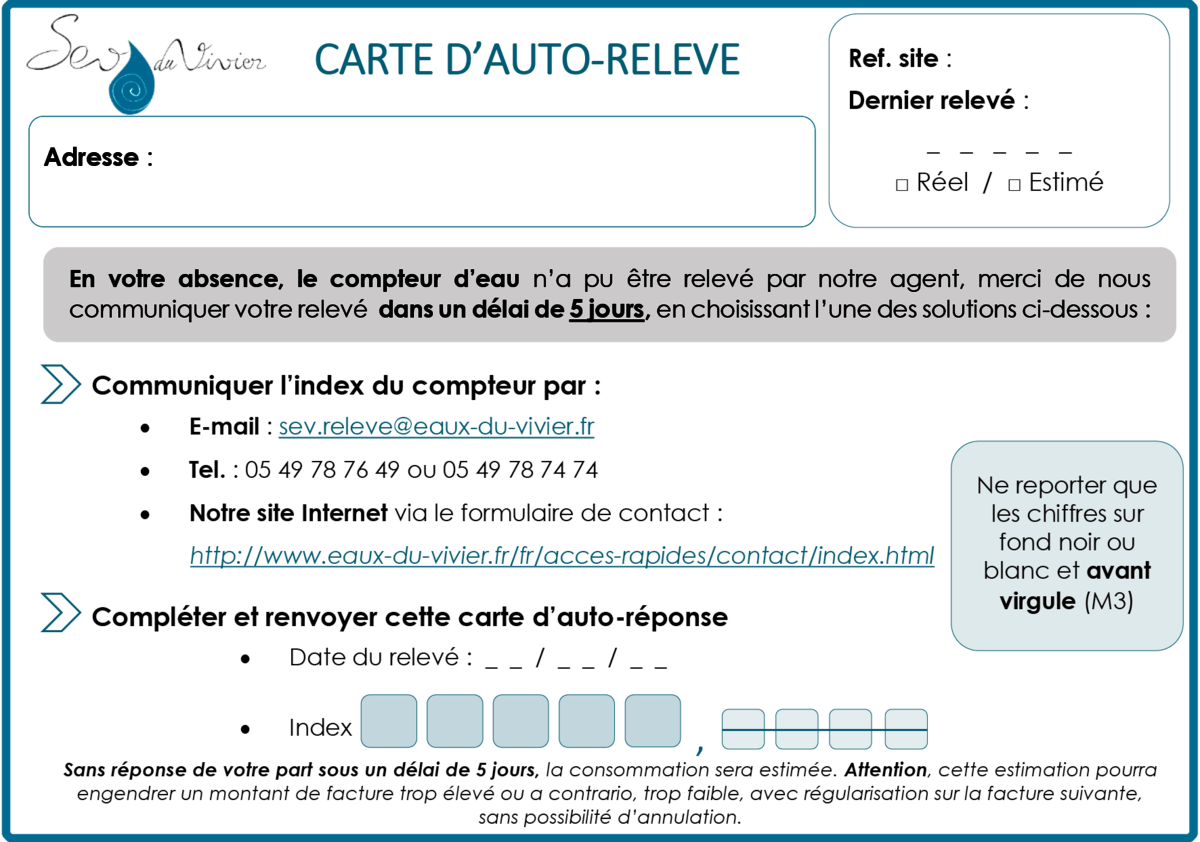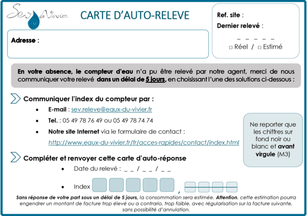 si votre compteur est inaccessible et que vous êtes absent, vous pouvez procéder vous-même à la relève. Il vous suffit de nous communiquer l’index sous 10 jours : en nous retournant la carte préaffranchie (carte T) déposée dans votre boîte aux lettres par le releveur, par téléphone ou directement en ligne.